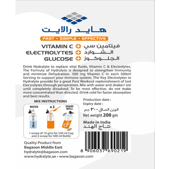 • HYDRALYTE Vitamin C + Electrolytes is specially designed for mass uses keeping in mind various health conditions and the low nutrition intake of industry workers.